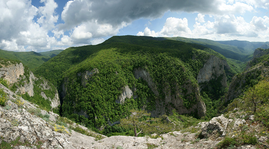 The canyon is located in the Crimean Mountains, 5 km southeast of the Sokolinoye village, Bakhchisaray District. It was created by a tectonic fault of the Crimean Mountains: a giant crack between Ai-Petri and the Sedam-Kaya and Boika ridges. It is over 3,500 m long, with the surrounding cliffs reaching 320 m in height. The canyon is famous for its picturesque waterfalls, cataracts and monumental marbled lime rocks. It is a federal landscape nature sanctuary.