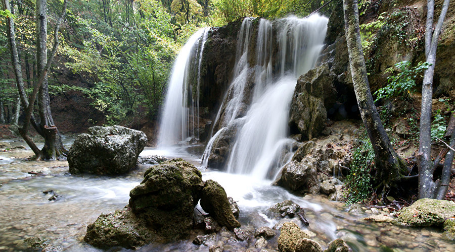 The waterfall is located in the Bakhchisarai District, about 550 m above sea level and 4.5 km south of the Sokolinoye village, in the Small Canyon. The waterfall used to be very picturesque, with a large mop of moss covering a cliff and sprays falling down towards a grotto underneath. The water looked silvery in hot summer days. At the beginning of 2016, a massive tuff boulder that was part of the waterfall collapsed due to rapid changes in temperature, and the waterfall lost its original appearance.